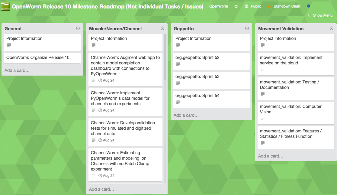 Below is a similarly organized board keeping track of our higher-level milestones in each repository (in the Muscle / Neuron / Channel list), which will be updated as this meta-project develops.